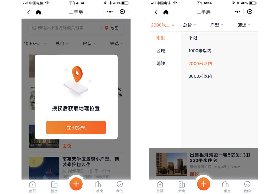 新版小程序支持用户授权获取地理位置,人性化显示周边的楼盘,可以从0-1000米、2000米、3000米范围内过滤楼盘,提高用户筛选时的便利性。