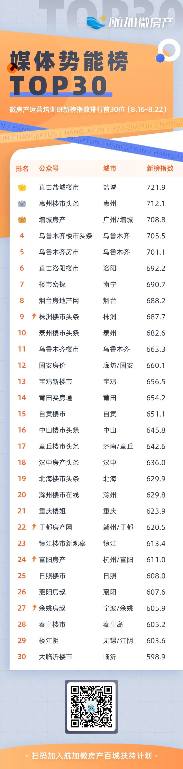 本期看点:富阳房产、余姚房叔冲进榜单前30名!株洲楼市头条、于都房产网进步明显。富阳房产自今年6月份加入航加房产培训体系以来,坚持写稿、不断优化选题,抓住本地热点内容,新榜指数稳步提升!终于冲进榜单前30名!同在浙江的余姚房叔,也是坚持输出本地楼市内容,尤其是写的学校学区内容经常能获得很高的阅读量,这次也是冲进了榜单前30名。于都房产网、株洲楼市头条也有较大进步,大家要继续加油呀!近期区域站点都在用航加房产的集字插件、投票插件、语音红包插件,在营销节点给开发商客户使用,大家反馈这种类型的线上活动成本低、效果好,百玩不厌!