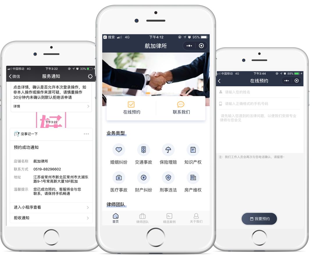 在线咨询后若有意向与该律所合作,便可在线办理预约,留下姓名与联系方式并提交后,便会收到预约成功的推送通知。与此同时律所后台也会收到订单消息,等待处理。
