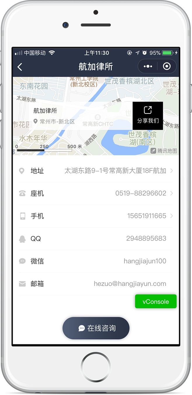 律所可以向用户展示公司地址、电话、邮箱等联系方式,点击地图即可开启导航,点击电话即可呼出拨打,更加便捷地把客户引导到店,用户也可以通过在线咨询直接与律所联系。