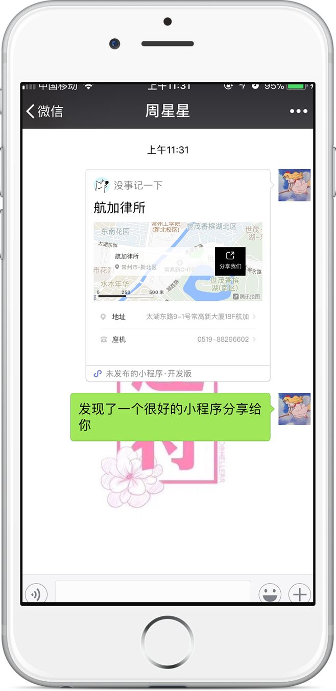 律所通小程序可以便捷地在微信中分享传播,律师团队页、精选案例详情页、地图位置详情页都支持分享当前页面,用户也可以直接转发小程序给微信好友或群组。