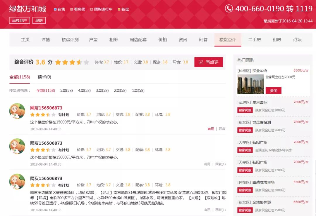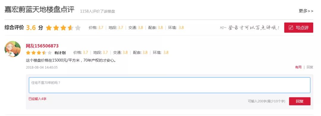 用户可以在他人的楼盘点评下进行回复,发表对此条评论的看法。这样的网友互动大大增加了网站的活力,解决了没有社区的房产网站缺少互动的问题。