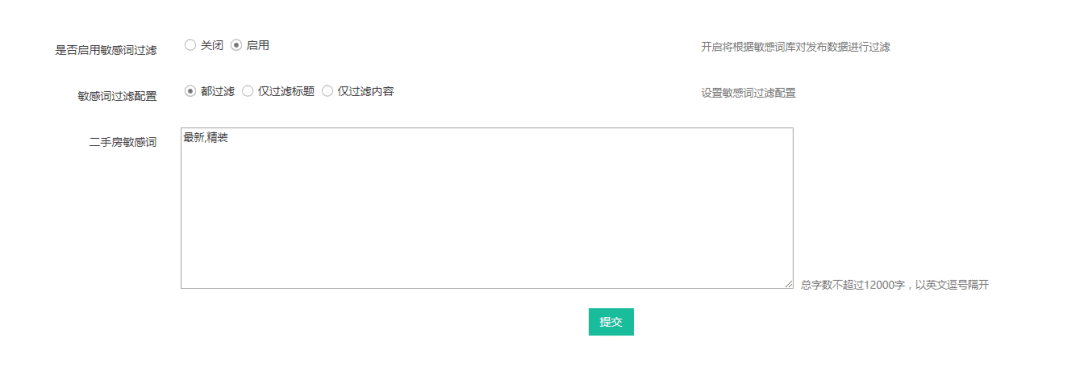 敏感词过滤功能配置十分便捷,启用敏感词过滤功能,即可选择敏感词过滤选项,包括“仅过滤内容”、“仅过滤标题”、“标题和内容都过滤”,然后可以在“二手房敏感词”文本框里输入相关的敏感词汇,大家可以根据需要进行配置。