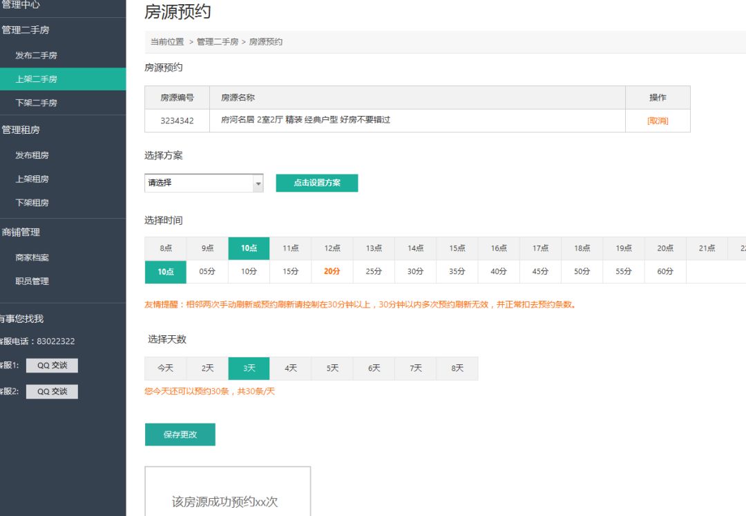 2.根据配置模版方案来预约刷新房源,比如:新增方案1包含8个时段 ,每天的预约刷新量是80,那么就可以选10套房源批量预约方案1,选择所需预约天数,这10套房源会按方案1每天在约定的时间去自动刷新。