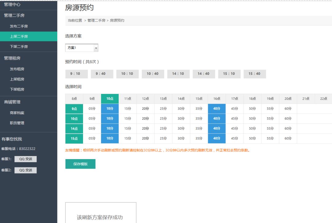 1.预约刷新模板功能可以设置5种不同时段的预约刷新方案,方便中介制定不同的刷新计划。