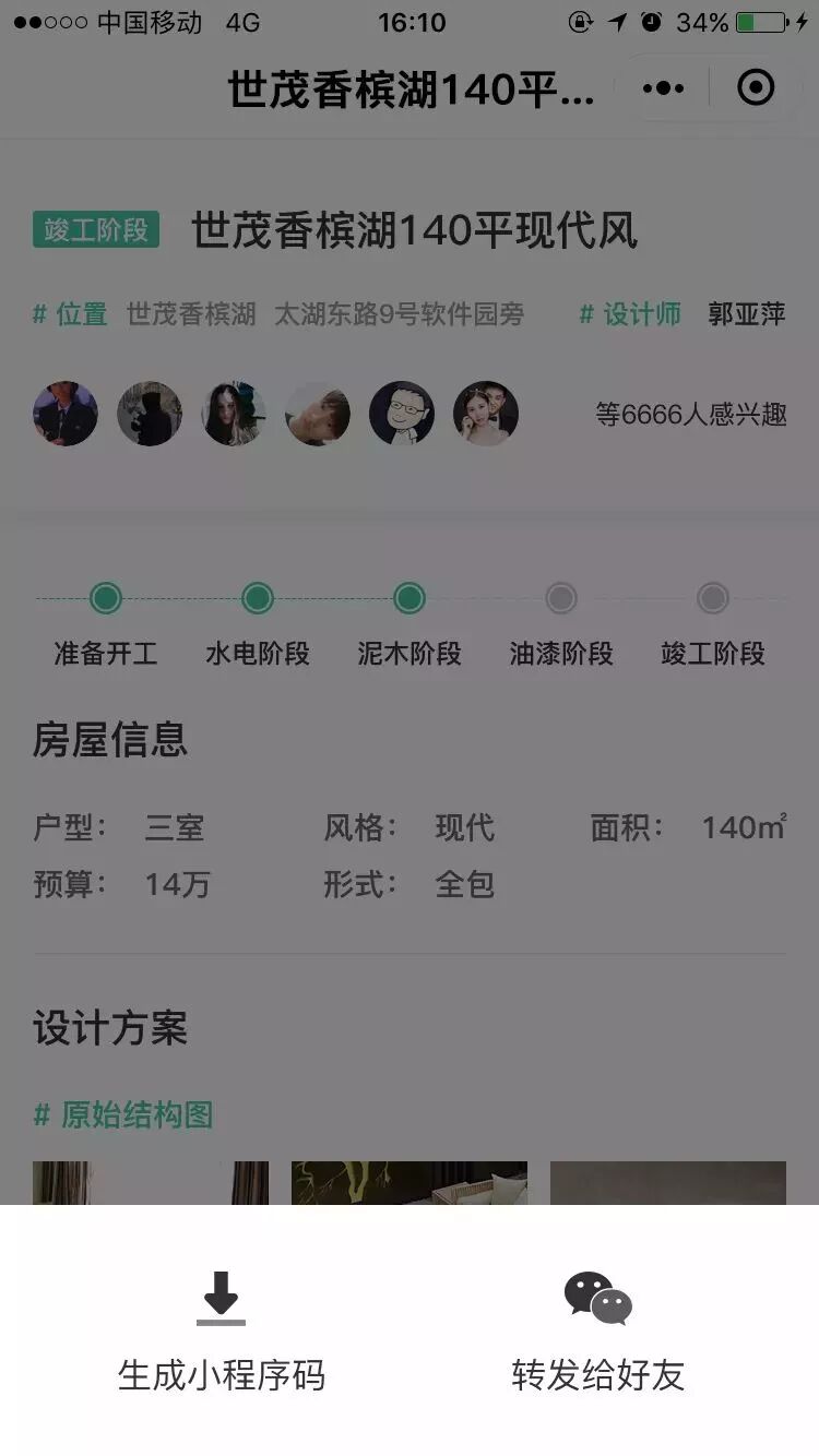 ②转发好友可一键分享工地给业主或群。工地更新后转发给业主,业主可以实时了解工地动态;转发到对接群,管家、项目经理等可以掌握工程进度;转发到小区业主群,展现有秩序的施工、整洁的现场和专业的施工技艺,可以吸引潜在用户的关注,提高有效订单量。