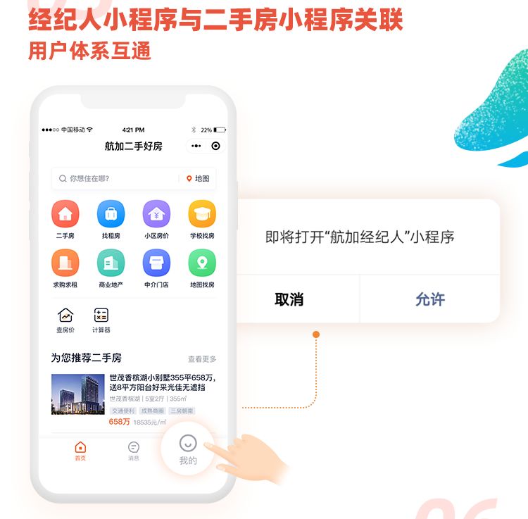 相比传统中介管理系统每次使用都需要输入账号和密码,航加房产中介小程序通过与微信的深度结合,把开启工作的钥匙交给了微信。