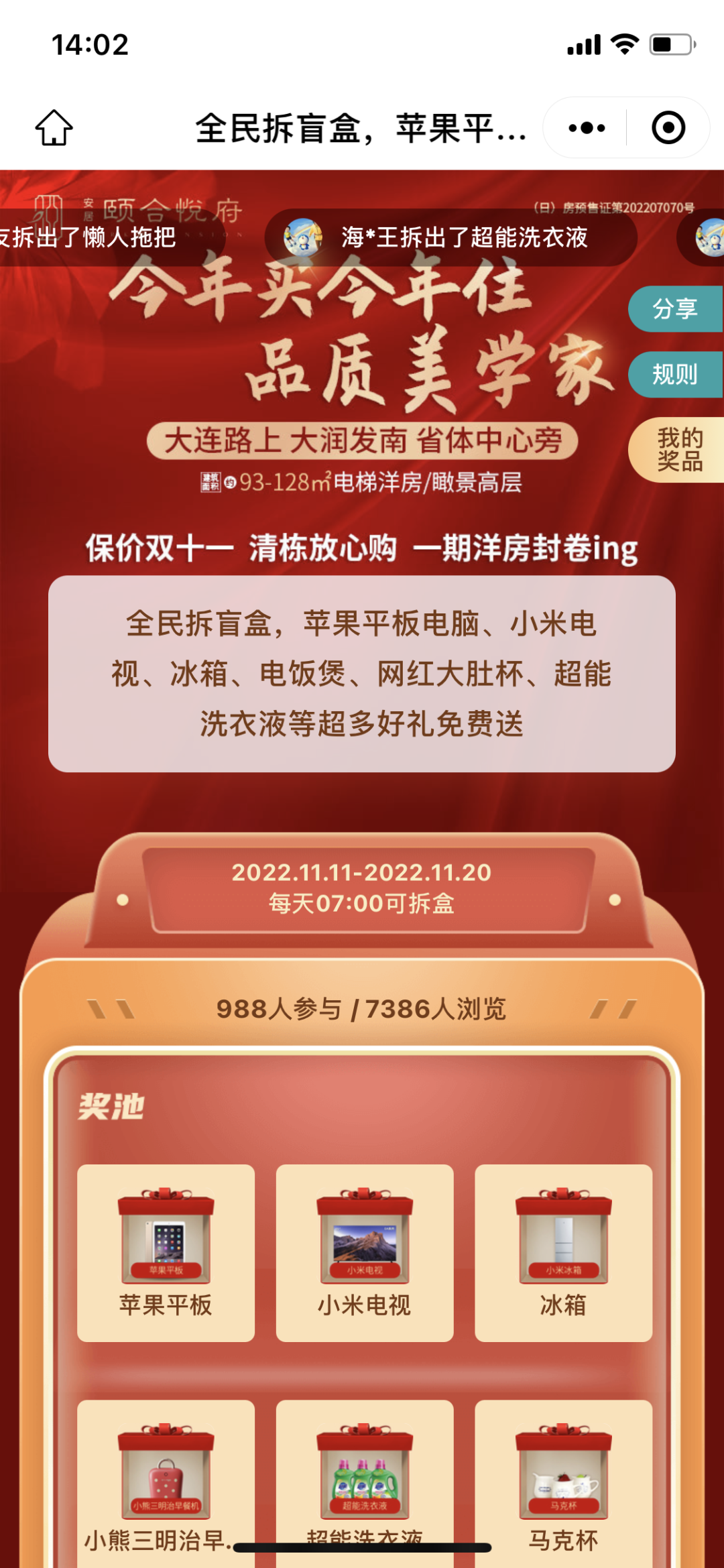 用户通过完成任务获得活动次数进行拆盒,随机获取礼品,这种充满未知性和随机性的抽奖形式深受用户喜爱。宜宾零距离房产、桔子卖房就使用了盲盒插件联动品牌方开展线上营销活动,实现精准曝光。