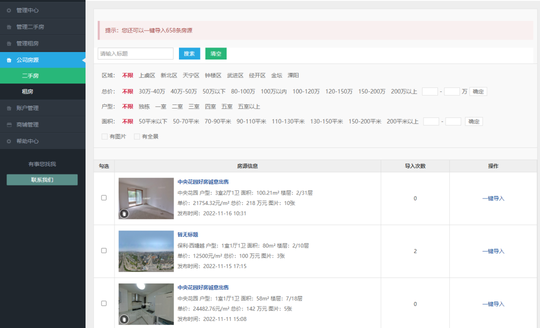 通过数据打通功能,中介可以通过后台公司房源库看到所有下发的房源,通过一键导入功能将此房源导入后台,修改标题即可正式使用。