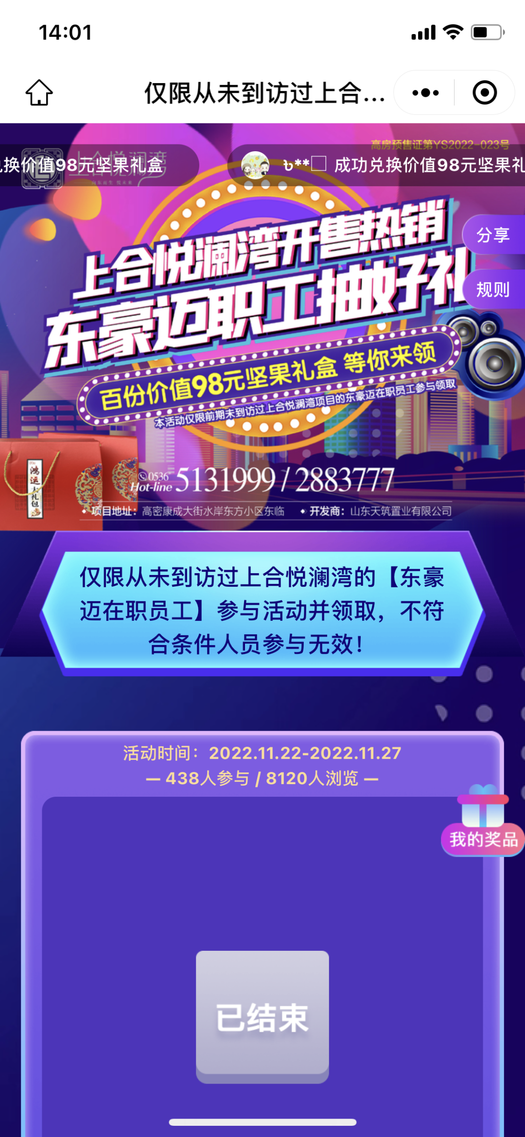 11月,高密房产网利用航加全新的营销插件——幸运大转盘,针对未到访过上合悦澜湾项目的特邀人群开展转转盘赢坚果礼盒的活动,吸引不少精准用户参与,活动参与度较高。