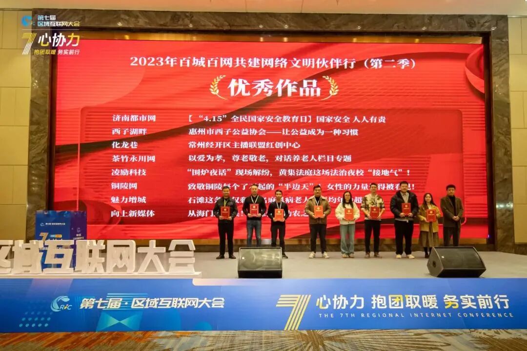 区域互联网大会不仅是经验分享的舞台,也是见证榜样力量的平台。大会第一天上午,区域网站党建联盟评选出了2023年百城百网共建网络文明伙伴行(第二季)的“优秀作品”、“正能量活动”、“创新创业项目”三个维度项目,现场为这些优秀项目进行了授牌。