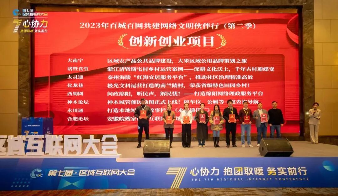 本届组委会代表、航加云CEO盛伟先生,为“创新创业项目”获奖单位——大南宁、诸暨食堂、太灵通、化龙巷、西蜀网、神木论坛、永川通、合肥论坛授牌。
